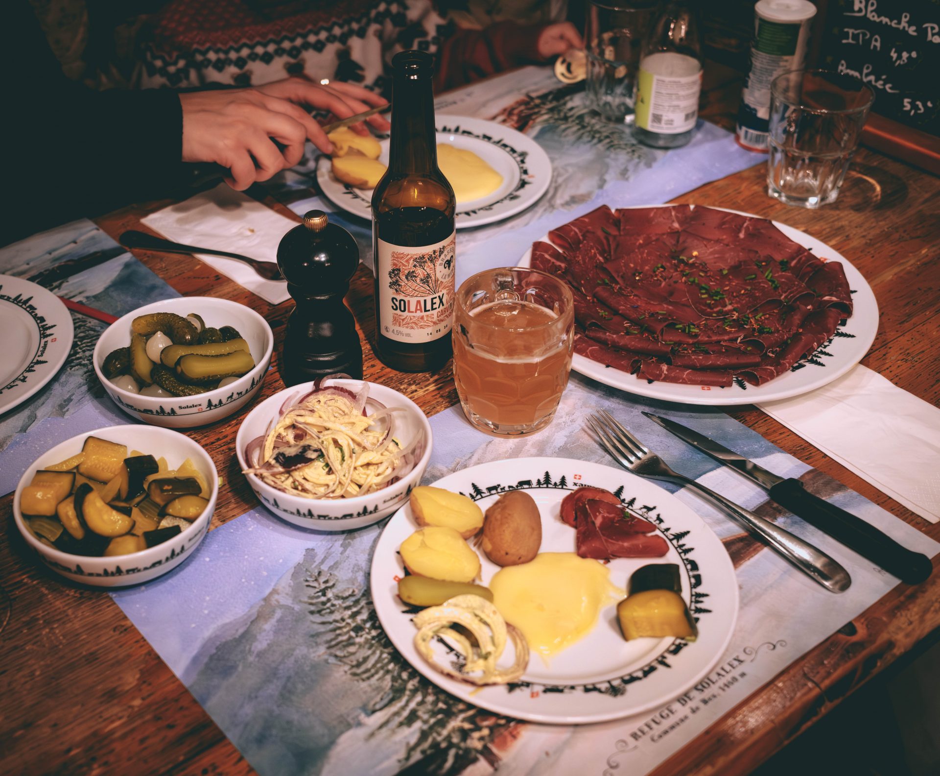 C’est sans hésiter notre plus gros coup de cœur culinaire du séjour, et même l’une des plus belles expériences vécues dans les Alpes vaudoises. Déjà, s’y rendre fait partie de l’expérience. En fin de journée, nous avons quitté Villars pour rejoindre Solalex, puis une motoneige est venue nous chercher au coucher du soleil. Le trajet, dans le silence de la montagne, entourés de sommets enneigés et de sapins, était déjà magique. Le refuge est incroyablement authentique. Bois brut, lumière chaude, feu qui crépite… on se sent immédiatement hors du temps. Ici, pas de chichi, juste une ambiance de vrai refuge de montagne, chaleureuse et sincère. Nous avons dégusté une raclette au feu de bois absolument délicieuse, fondante, généreuse, servie dans les règles de l’art. Un moment simple, convivial, qui fait un bien fou.