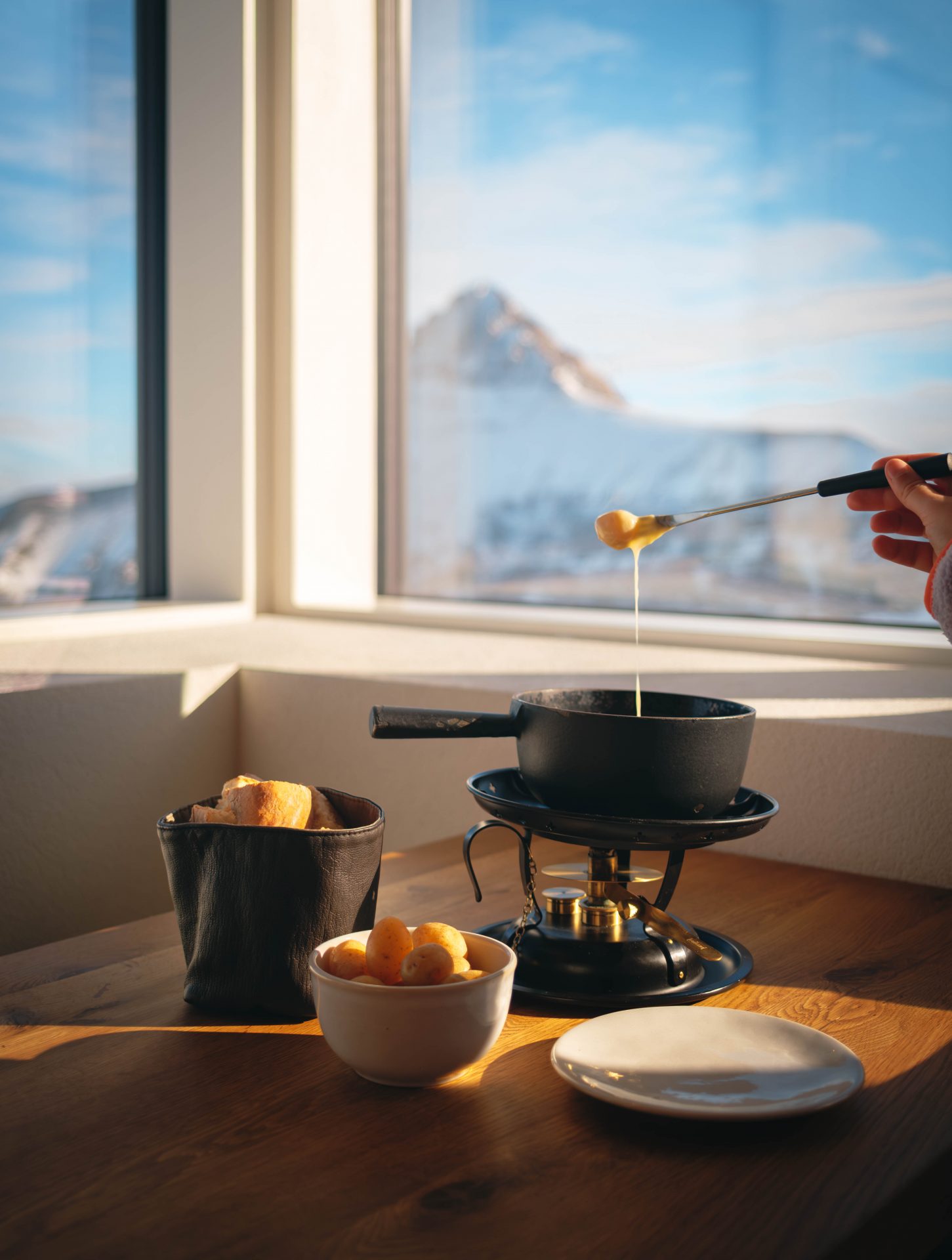 Pour notre séjour à Villars, nous avons posé nos valises à l’Hôtel Alpe Fleurie, et très honnêtement, difficile d’imaginer un emplacement plus pratique et agréable pour découvrir la station en hiver. Situé juste en face de la gare de Villars, l’hôtel est parfaitement connecté aux transports : le train arrive au cœur du village, et en quelques pas seulement, on est déjà installés. En plein hiver, avec la neige, les valises et l’envie de simplicité, c’est un vrai luxe. Tout est accessible à pied : les restaurants, les commerces, la patinoire, les balades… On oublie complètement la voiture. Nous avons eu la chance de séjourner dans un appartement récemment rénové, et ce fut un vrai cocon alpin. La décoration mêle élégamment le style montagnard suisse et une touche contemporaine très réussie. Bois clair, matières chaleureuses, lignes épurées… on s’y sent immédiatement bien. Les chambres étaient spacieuses, confortables, parfaitement adaptées à un séjour en famille, avec suffisamment d’espace pour que chacun trouve sa place sans jamais se sentir à l’étroit. Depuis l’appartement, la vue sur les montagnes était absolument splendide. Nous avons eu droit à de magnifiques couchers de soleil, avec la lumière dorée qui embrasait les sommets et le village en contrebas. Ces moments, en fin de journée, ont clairement fait partie de nos plus beaux souvenirs à Villars. On ralentit, on observe, on profite simplement de l’instant. Côté restauration, l’expérience a été tout aussi réussie. Le petit déjeuner était copieux et de grande qualité, avec des produits frais et une ambiance calme, parfaite pour bien commencer la journée avant de filer vers les pistes ou les balades. Un soir, nous avons également dîné sur place et testé la fondue bourguignonne. Un vrai régal : généreuse, savoureuse, et idéale après une journée passée dans le froid.