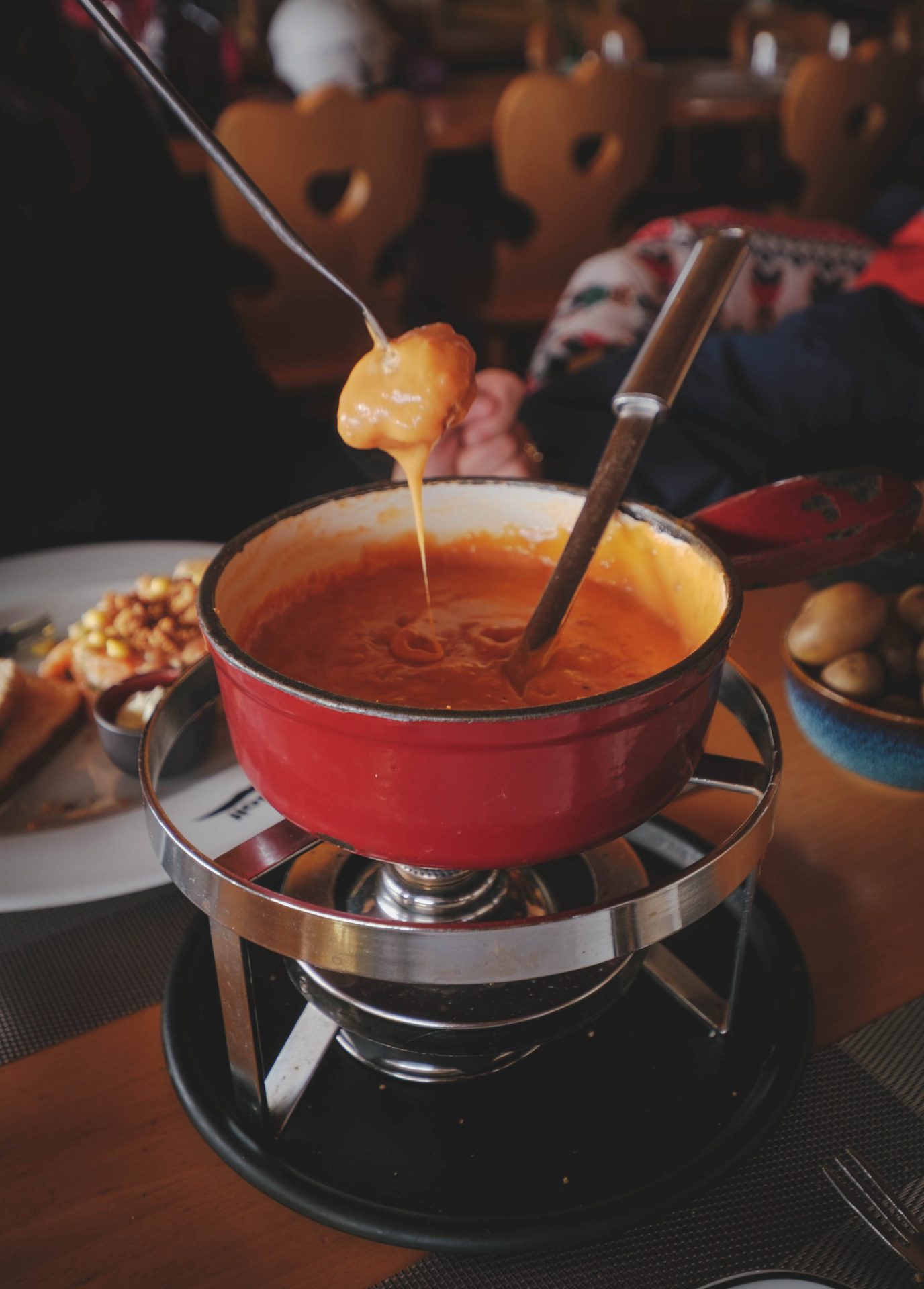 C’est l’adresse parfaite pour une pause après quelques descentes à ski… ou simplement pour profiter d’une vue sublime, même quand on ne skie pas, comme nous. Le restaurant du Golf offre un panorama spectaculaire sur les pistes et les montagnes environnantes. Les skieurs passent juste devant vous, ce qui donne une atmosphère très vivante et typiquement alpine. Si vous êtes piétons, il est très facile de s’y rendre en train en s’arrêtant directement à la station « Restaurant du Golf ». Nous y avons testé la fondue à la tomate, une spécialité suisse moins classique mais absolument délicieuse. Réconfortante, parfumée, parfaite après une journée passée dans le froid. L’ambiance est conviviale, le service chaleureux, et on s’attarde facilement à table tant le décor est agréable.