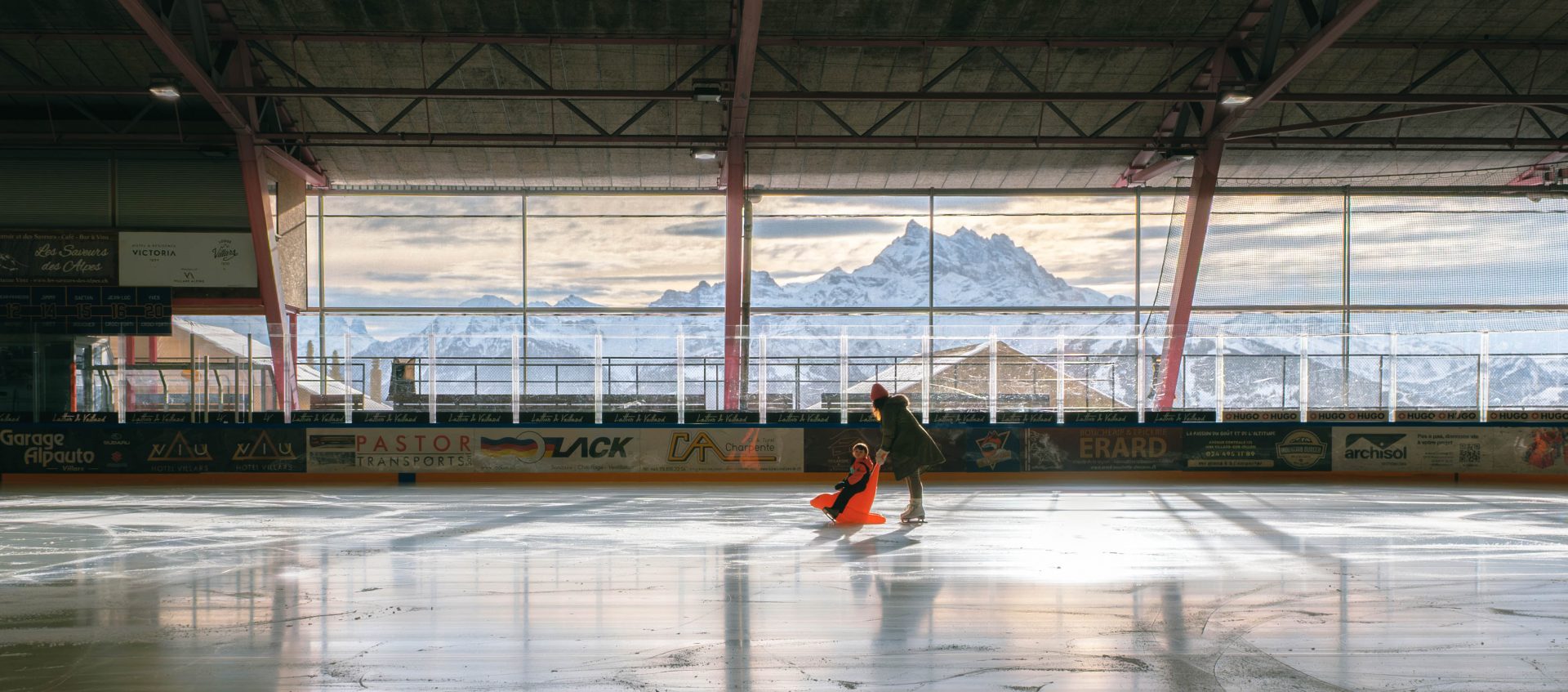 Parmi nos très beaux souvenirs à Villars, il y a sans hésitation la patinoire de Villars-sur-Ollon. Nous avons eu une chance incroyable : en arrivant, la glace était presque vide. Pendant un long moment, nous avons eu l’impression d’avoir la patinoire rien que pour nous. La patinoire est semi-extérieure, entourée par les montagnes, ce qui rend l’expérience particulièrement magique. Glisser sur la glace avec ce décor alpin, le froid sec de l’hiver et cette lumière si particulière des Alpes… c’est exactement le genre de moments simples mais précieux que l’on adore vivre en famille. Même sans être de grands patineurs, le plaisir est immédiat. Le lieu est très bien aménagé et accessible à tous. On peut louer des patins directement sur place, ce qui évite de s’encombrer, et l’espace est suffisamment vaste pour que chacun puisse évoluer à son rythme. L’ambiance est calme, loin des patinoires bondées que l’on peut connaître ailleurs, et cela contribue énormément au sentiment de sérénité. Ce que nous avons particulièrement aimé, c’est cette impression de douceur et de lenteur. On prend le temps, on rit des petites chutes, on fait quelques tours de piste sans se presser, simplement pour le plaisir. La patinoire devient alors bien plus qu’une activité : c’est une vraie parenthèse dans le séjour, un moment où l’on se reconnecte, entourés de paysages sublimes.