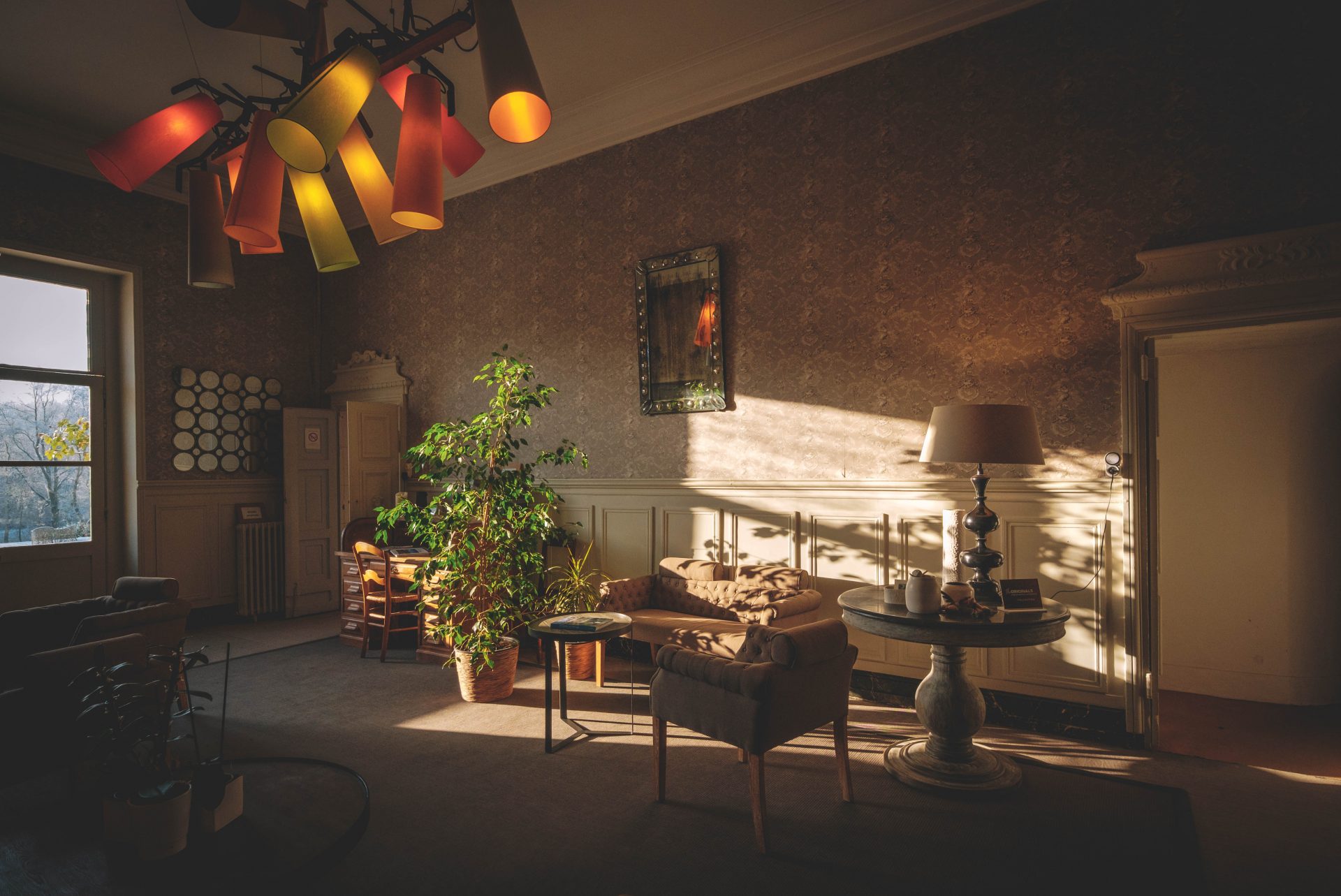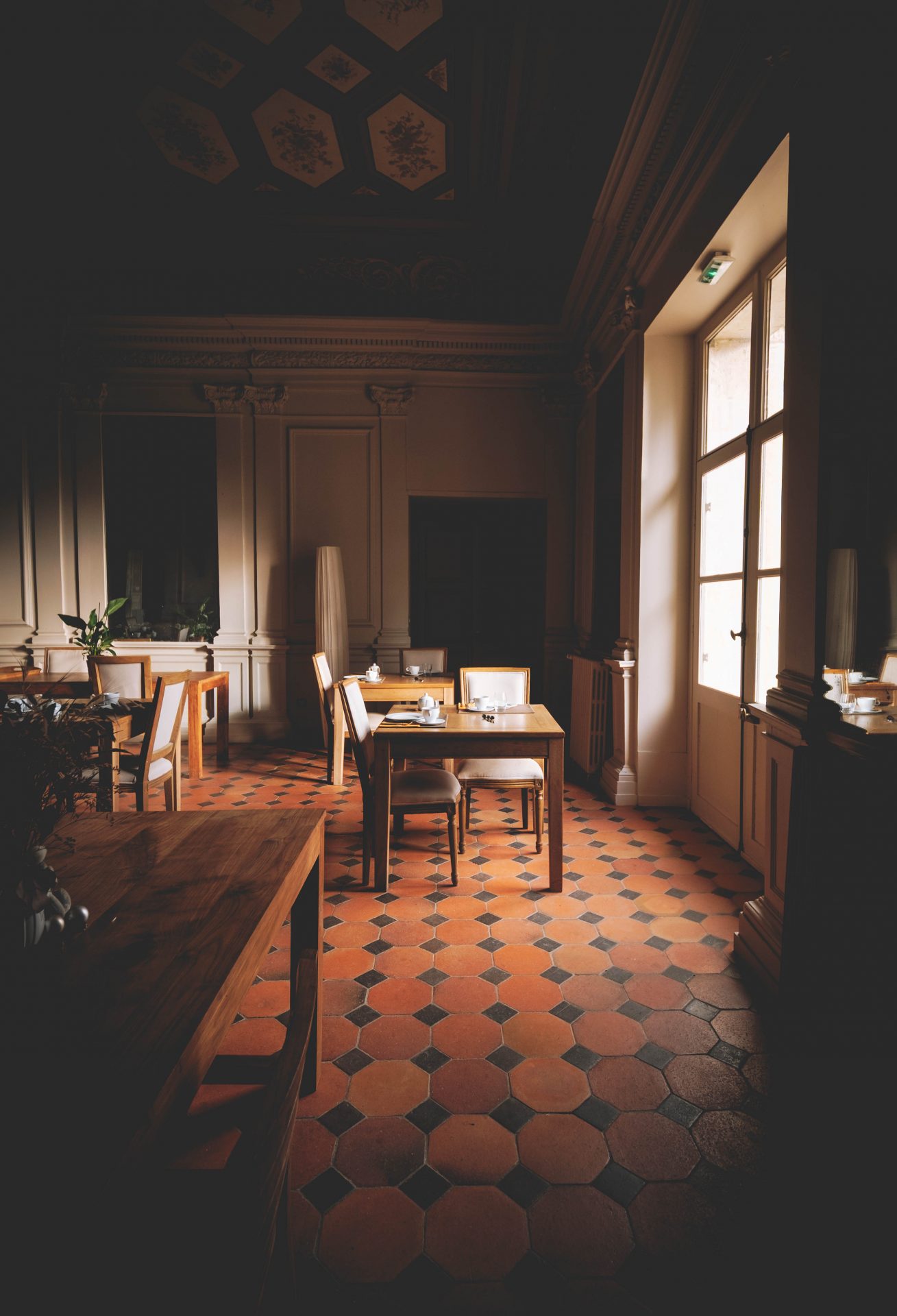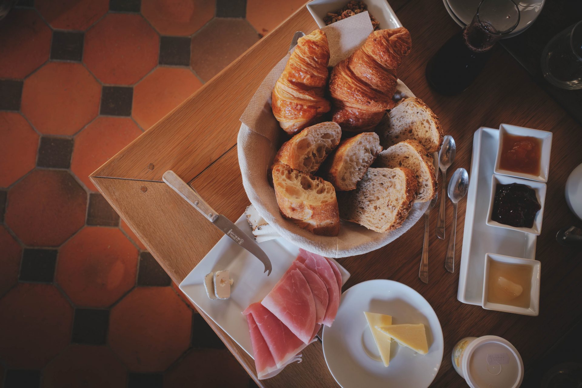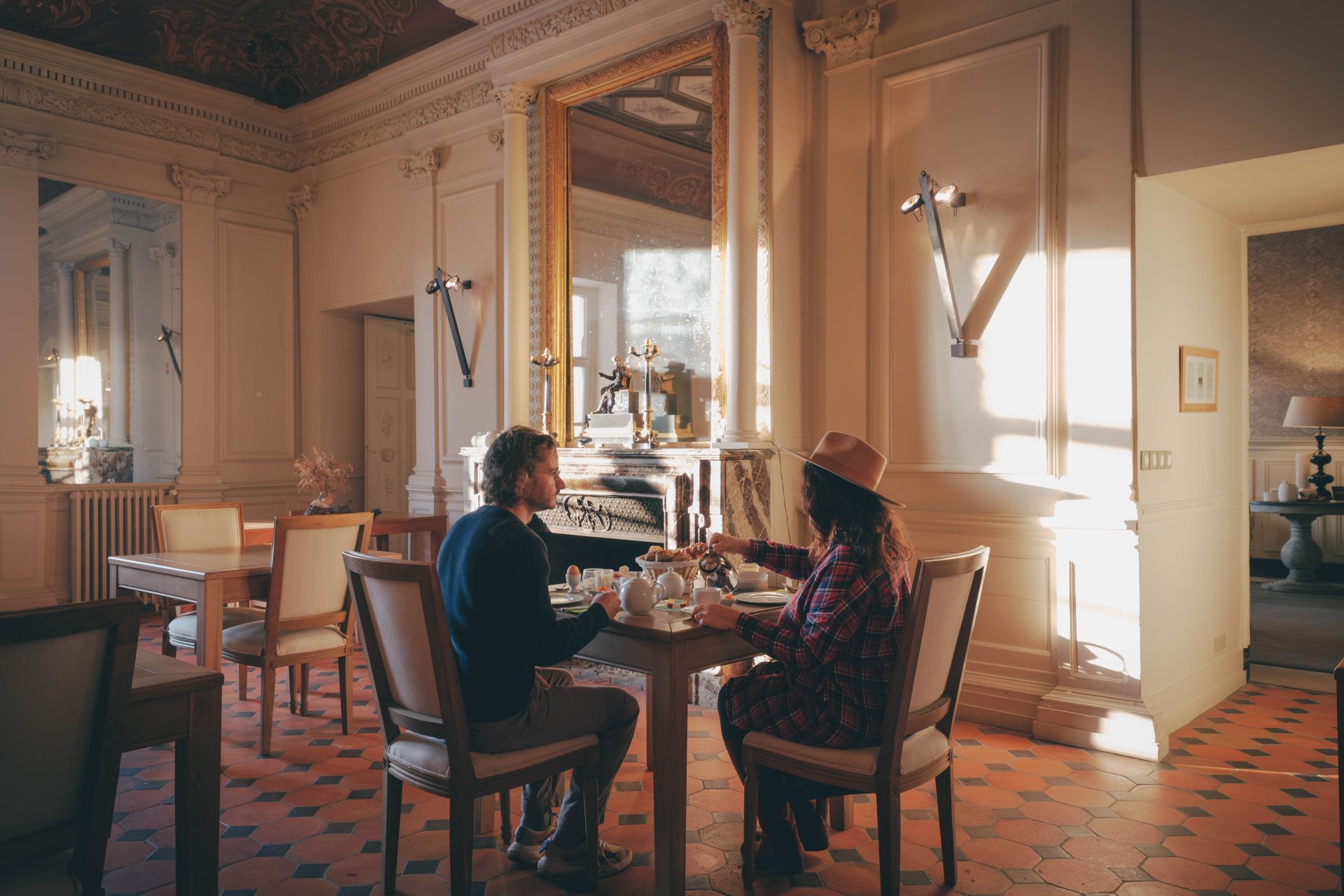 Après nos promenades hivernales, nous aimions nous retrouver dans les salons du château, autour d’un café ou d’un livre. Les espaces sont chaleureux, pensés pour le repos et l’échange. On s’y sent rapidement chez soi. Le temps semble s’écouler plus doucement, sans contrainte. Le matin, le petit déjeuner est un moment à part entière. Ce jour-là, un feu de cheminée crépitait dans la salle du petit déjeuner. Dehors, le jardin était entièrement recouvert de neige. À table, les produits étaient à la hauteur du lieu. Yaourts locaux, fromages, œufs, jambon, pains frais, croissants, granola maison, confitures, jus de cassis-pomme… Le tout servi avec soin, dans une ambiance paisible, face à la nature. Ce qui nous a profondément marqués ici, c’est l’authenticité du lieu. Les matériaux sont nobles, durables, sans artifices inutiles. Pas de plastique, pas de décor surfait. Tout est pensé pour durer, pour s’inscrire dans le temps. Le calme, la nature, la dimension humaine de l’établissement font toute la différence.