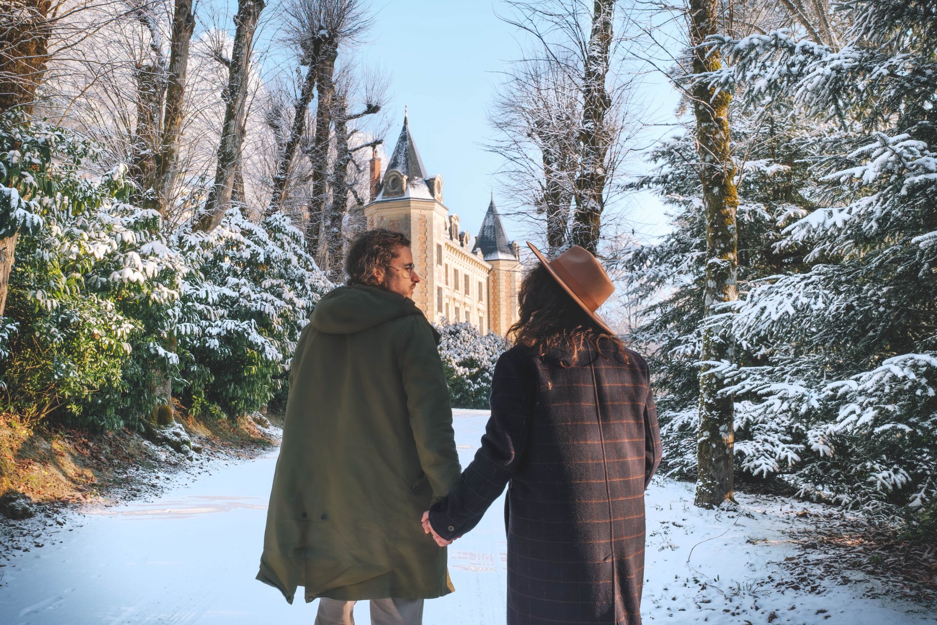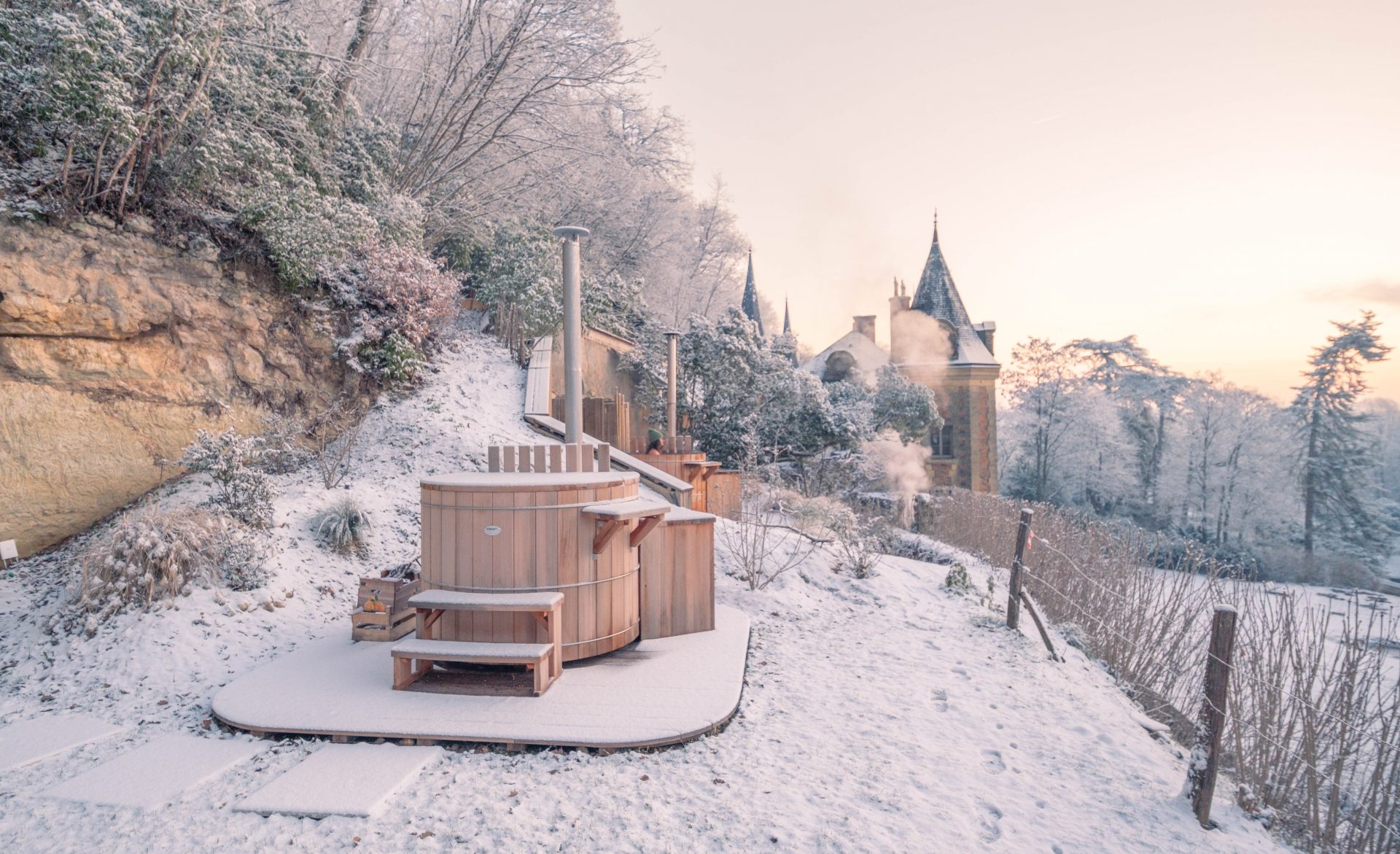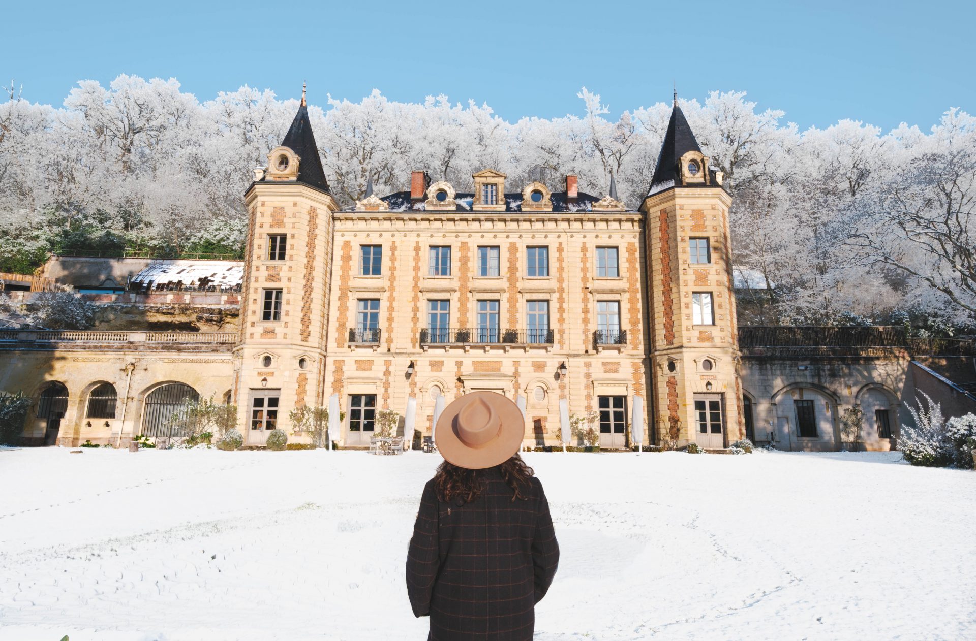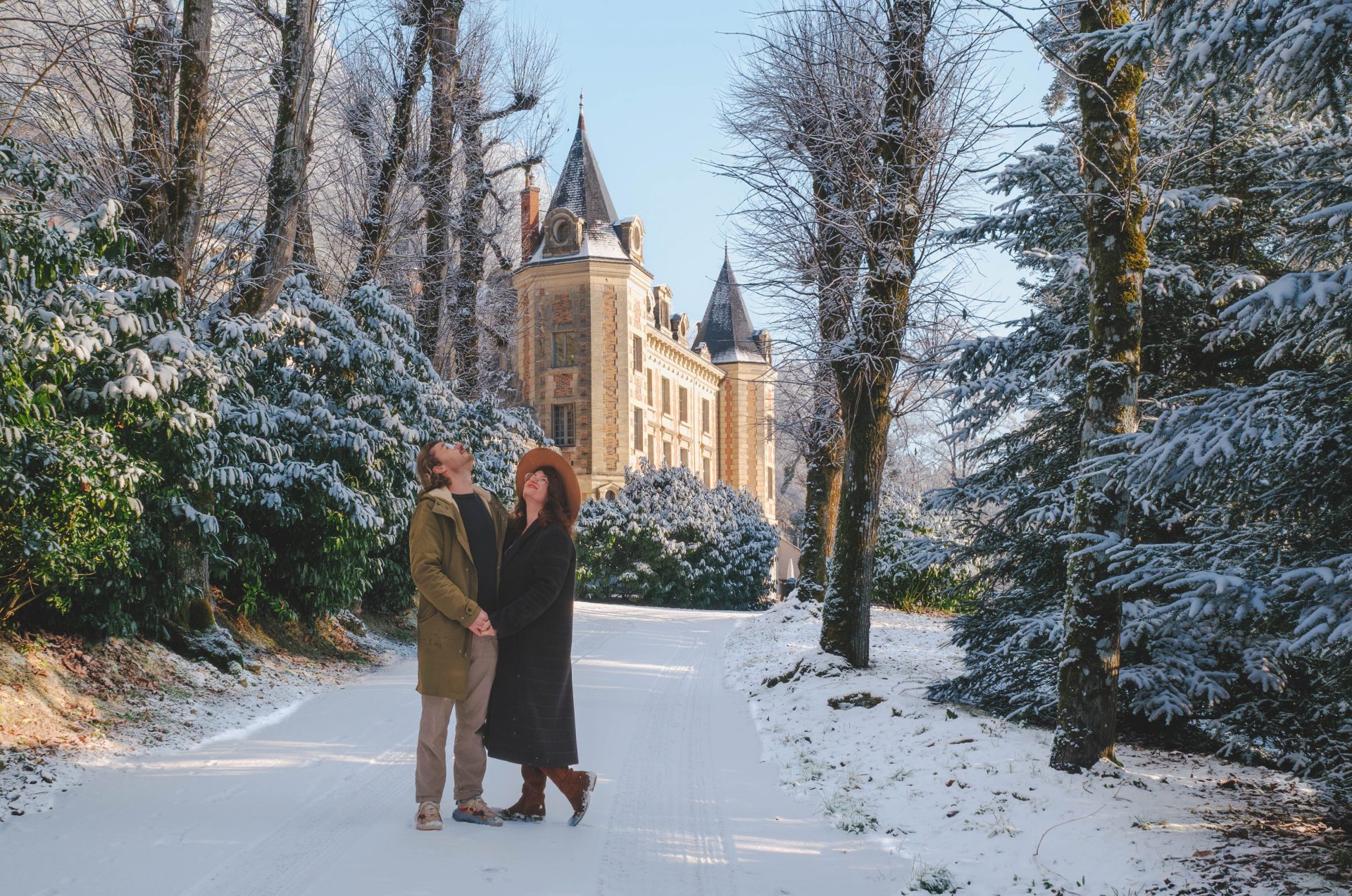 Ce que nous avons particulièrement aimé ici, c’est ce rapport au temps. Rien n’est imposé. On peut passer de longues minutes à observer la nature, puis rentrer se réchauffer à l’intérieur du château autour d’un café. Les salons invitent à la pause. La pierre, le bois, les matières naturelles créent une ambiance douce et chaleureuse. On a le sentiment d’être dans une grande maison de famille, loin des hôtels impersonnels. La nuit venue, la magie a continué d’opérer. Il a commencé à neiger doucement. De gros flocons sont tombés sans bruit, transformant peu à peu le domaine en décor de conte. Le lendemain matin restera longtemps gravé dans nos mémoires. Un ciel rosé, une épaisse couche de neige, et surtout ces traces d’animaux dessinées dans le jardin. Seuls les pas de chevreuils et d’un sanglier semblaient avoir troublé le calme nocturne. Le château, posé au milieu de ce décor immaculé, semblait veiller sur la vallée.