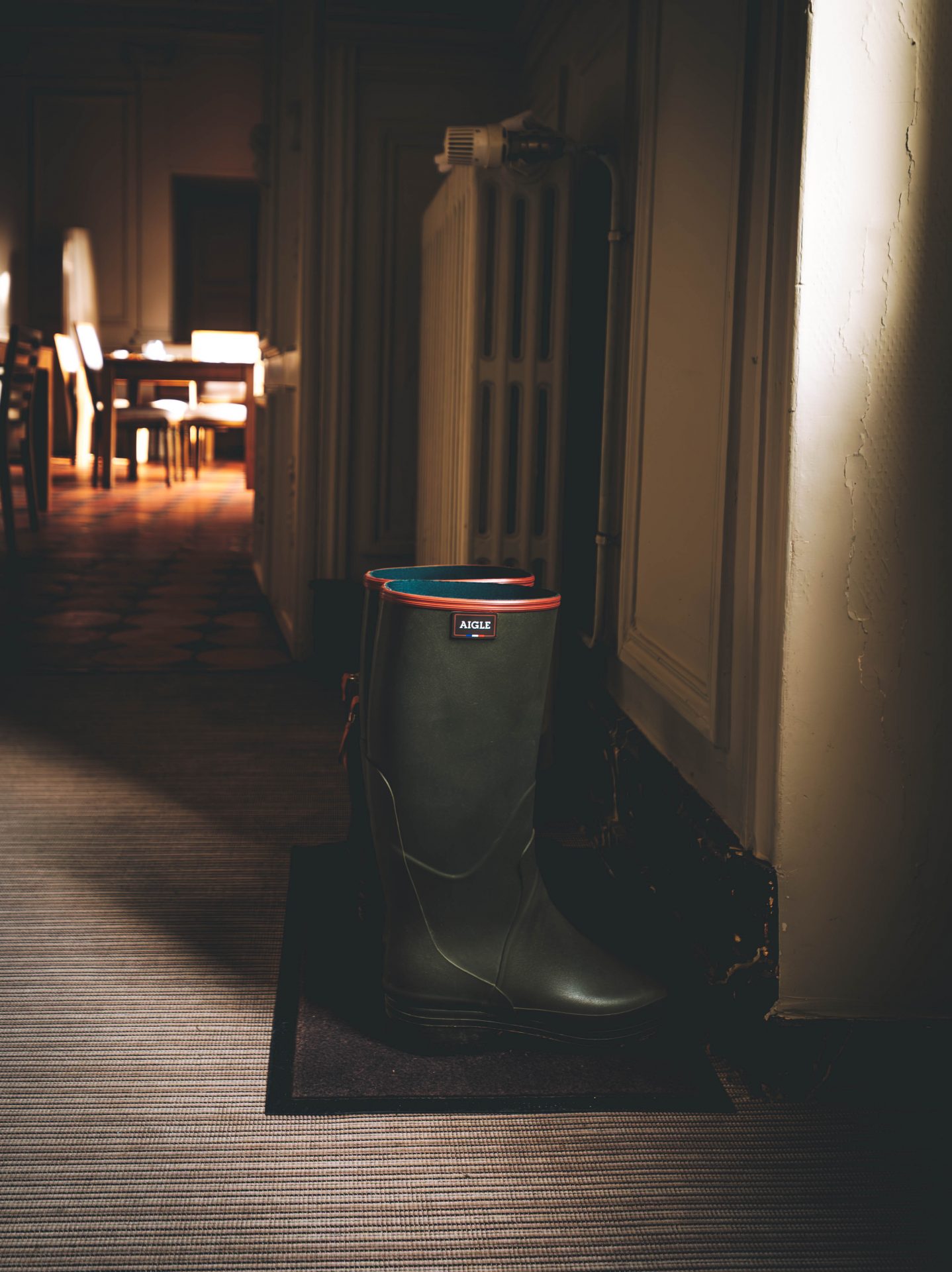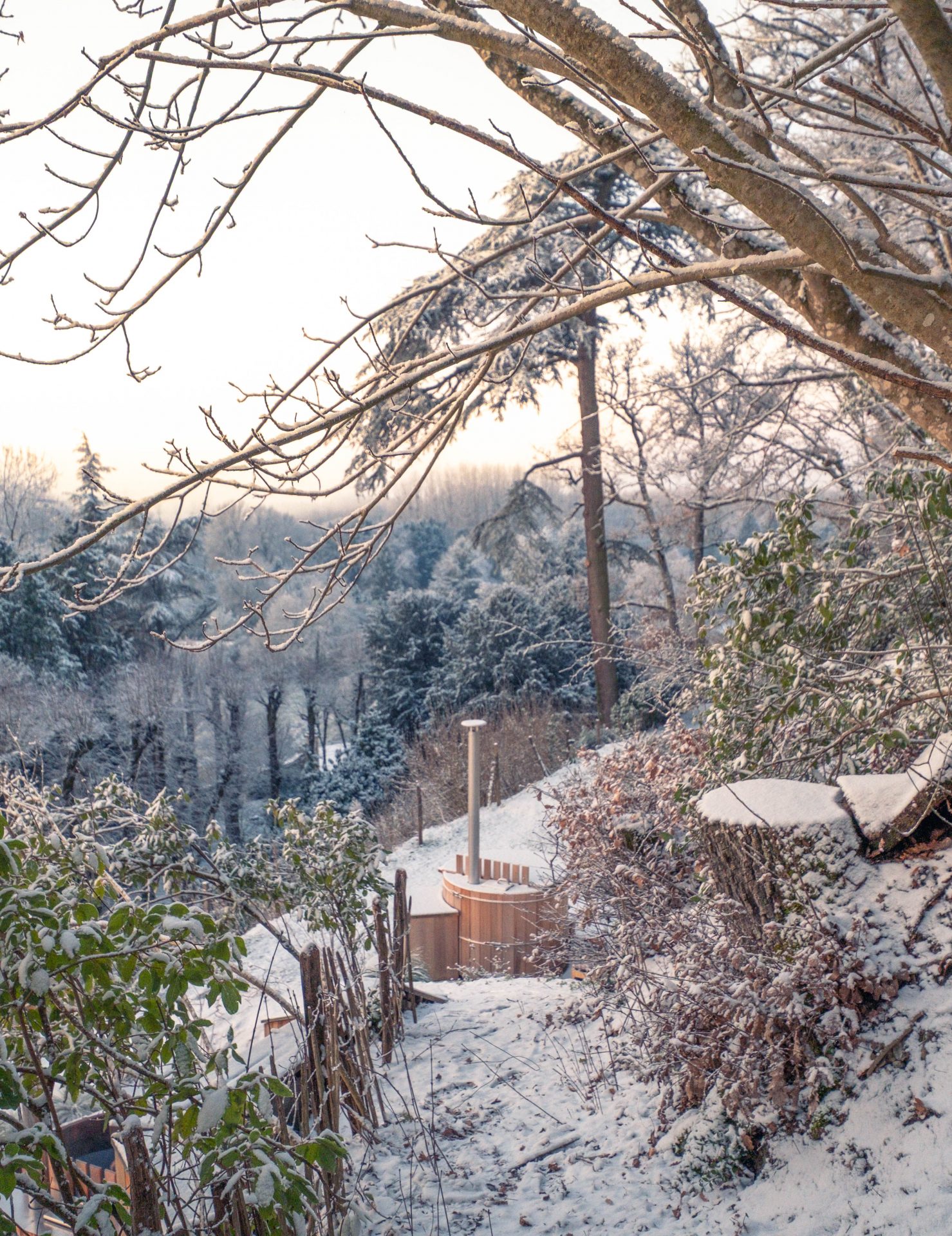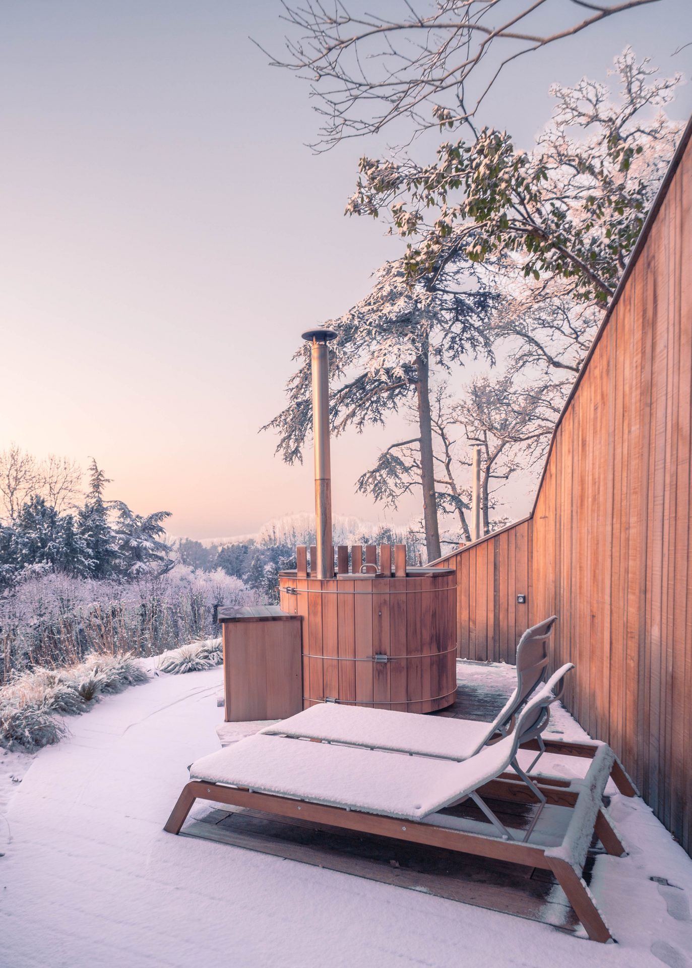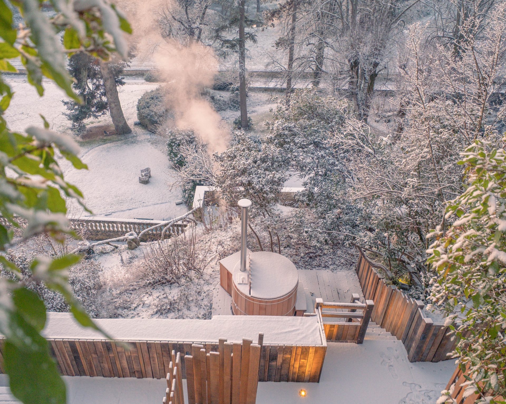 Ce que nous avons particulièrement aimé ici, c’est ce rapport au temps. Rien n’est imposé. On peut passer de longues minutes à observer la nature, puis rentrer se réchauffer à l’intérieur du château autour d’un café. Les salons invitent à la pause. La pierre, le bois, les matières naturelles créent une ambiance douce et chaleureuse. On a le sentiment d’être dans une grande maison de famille, loin des hôtels impersonnels. La nuit venue, la magie a continué d’opérer. Il a commencé à neiger doucement. De gros flocons sont tombés sans bruit, transformant peu à peu le domaine en décor de conte. Le lendemain matin restera longtemps gravé dans nos mémoires. Un ciel rosé, une épaisse couche de neige, et surtout ces traces d’animaux dessinées dans le jardin. Seuls les pas de chevreuils et d’un sanglier semblaient avoir troublé le calme nocturne. Le château, posé au milieu de ce décor immaculé, semblait veiller sur la vallée.