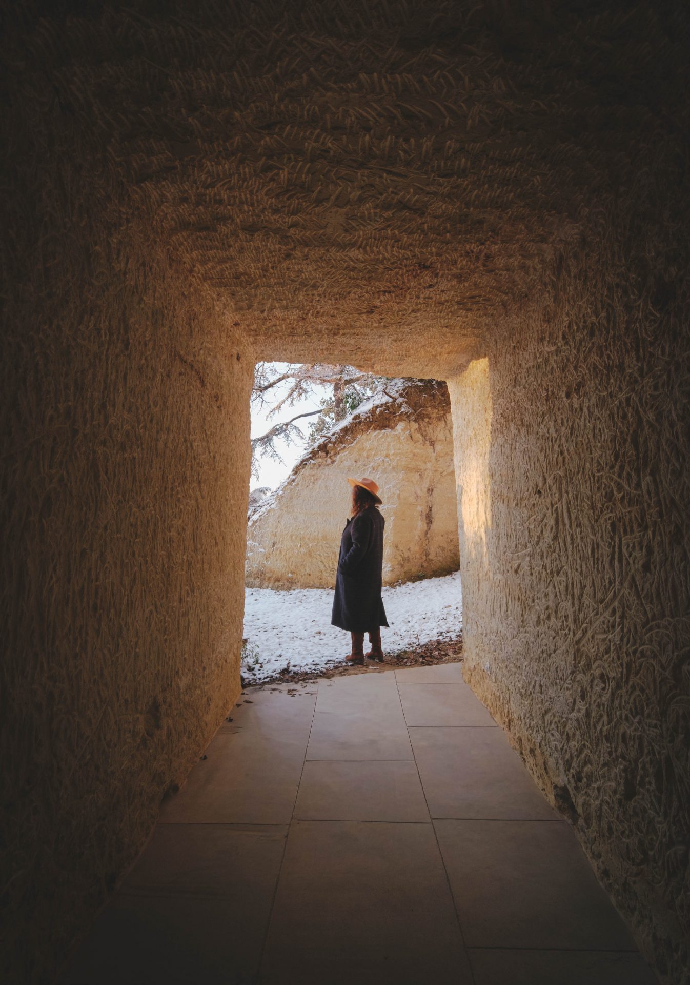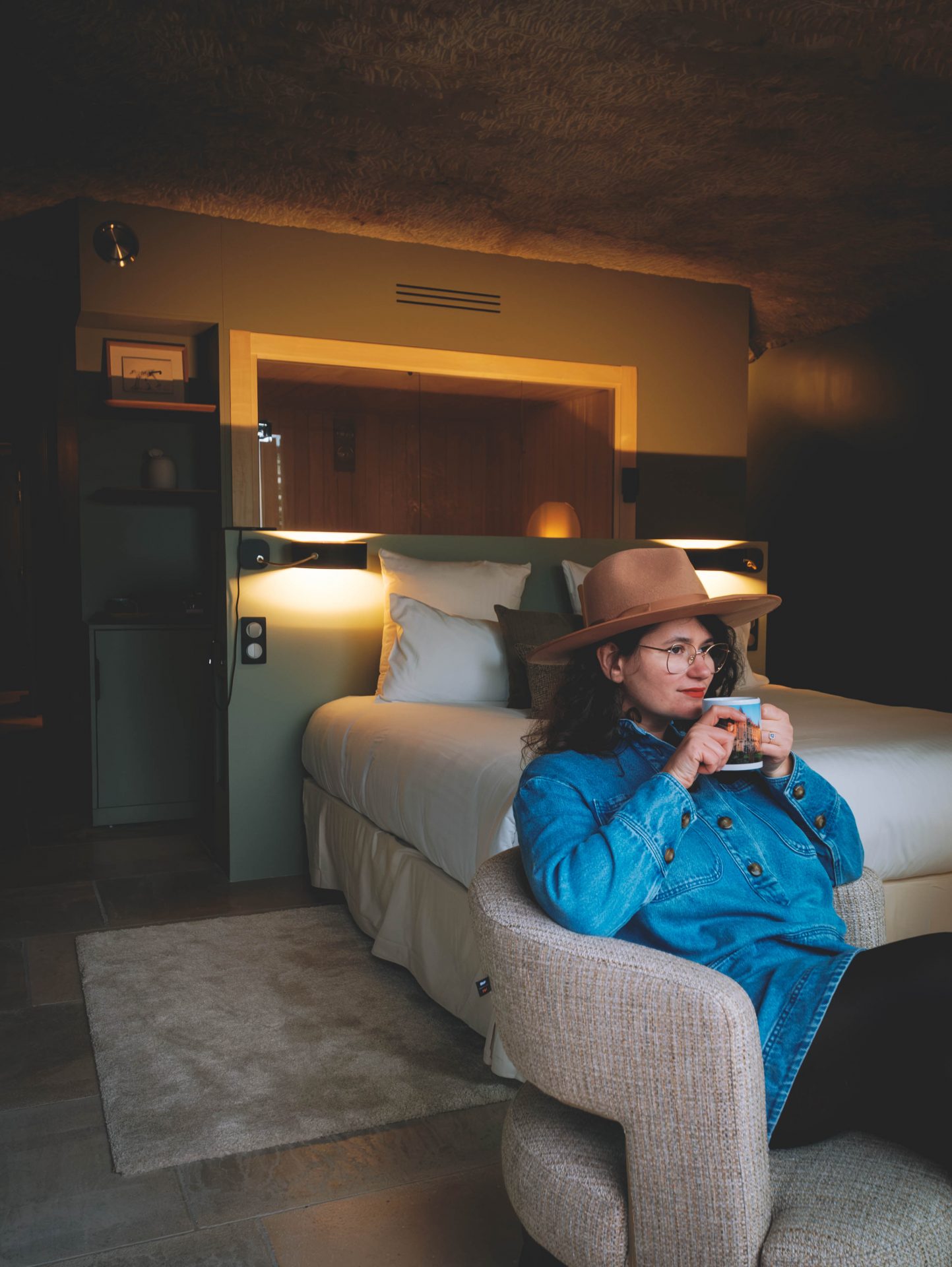 Nous avons eu la chance de séjourner dans l’une des nouvelles suites troglodytiques du domaine. Une expérience unique, profondément ancrée dans l’histoire et l’identité de la région. Le Val de Loire est connu pour ses habitats creusés dans le tuffeau, cette pierre calcaire claire qui a servi pendant des siècles à façonner châteaux, maisons et caves. Dormir dans une suite troglodytique, c’est prolonger cette histoire de manière contemporaine. L’accès à la suite se fait par un long couloir creusé dans la roche. Dès les premiers pas, nous avons eu l’impression de pénétrer dans un lieu presque muséal. L’éclairage, sobre et parfaitement maîtrisé, met en valeur la pierre brute. L’esthétique est épurée, élégante, presque silencieuse. C’est une entrée en matière très poétique, qui donne le ton de l’expérience à venir.