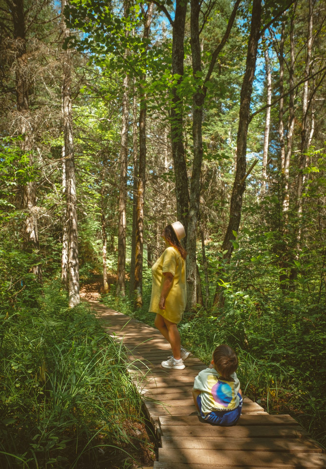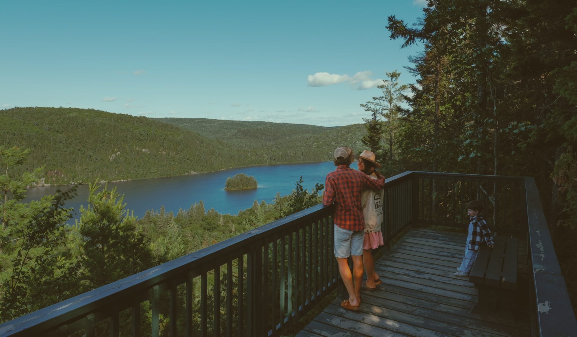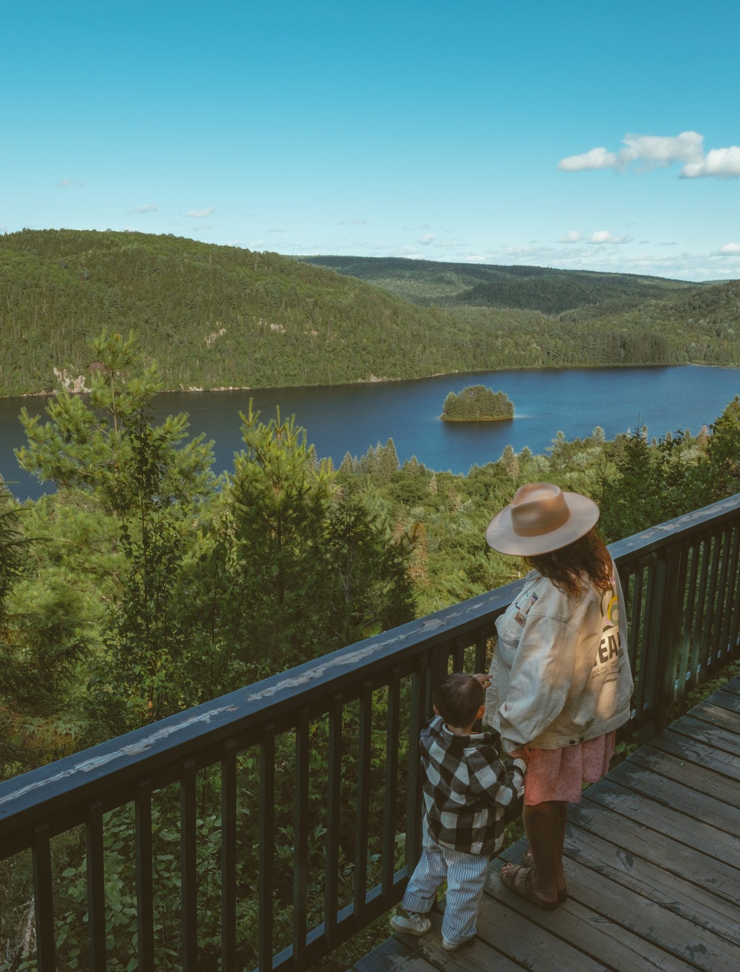 S’il y a bien un endroit qui incarne à lui seul la nature québécoise telle qu’on l’imagine, c’est le parc national de la Mauricie. En arrivant, on a eu cette impression de se retrouver dans un décor de film : plus de 150 lacs, des forêts à perte de vue, des routes panoramiques qui serpentent au milieu des collines. Rien que la route de 65 kilomètres qui traverse le parc est une expérience en soi, ponctuée d’arrêts spectaculaires. Nous avons suivi l’itinéraire contemplatif recommandé par les rangers, et c’était exactement ce qu’il nous fallait avec James. Des pauses régulières pour profiter des paysages, des sentiers courts et accessibles, mais toujours avec ce petit côté “waouh” qui surprend au détour du chemin. Parmi nos coups de cœur : le belvédère de l’île aux Pins, qui offre une vue à 360° sur une mosaïque de lacs et de forêts. Un panorama à couper le souffle, où l’on reste longtemps, simplement à regarder le temps passer. Nous avons aussi testé quelques randonnées faciles. Le sentier des Cascades, avec ses 2 kilomètres, est idéal en famille : une succession de petites chutes d’eau et de bassins naturels où l’on peut même tremper les pieds en été. James s’est amusé à jeter des cailloux dans l’eau et à courir d’un rocher à l’autre. Plus exigeant mais tout aussi beau, le sentier des Falaises (3,8 km) offre de superbes panoramas sur la vallée et les lacs en contrebas. La faune n’est jamais loin : nous avons croisé des écureuils joueurs et vu des hérons en vol.