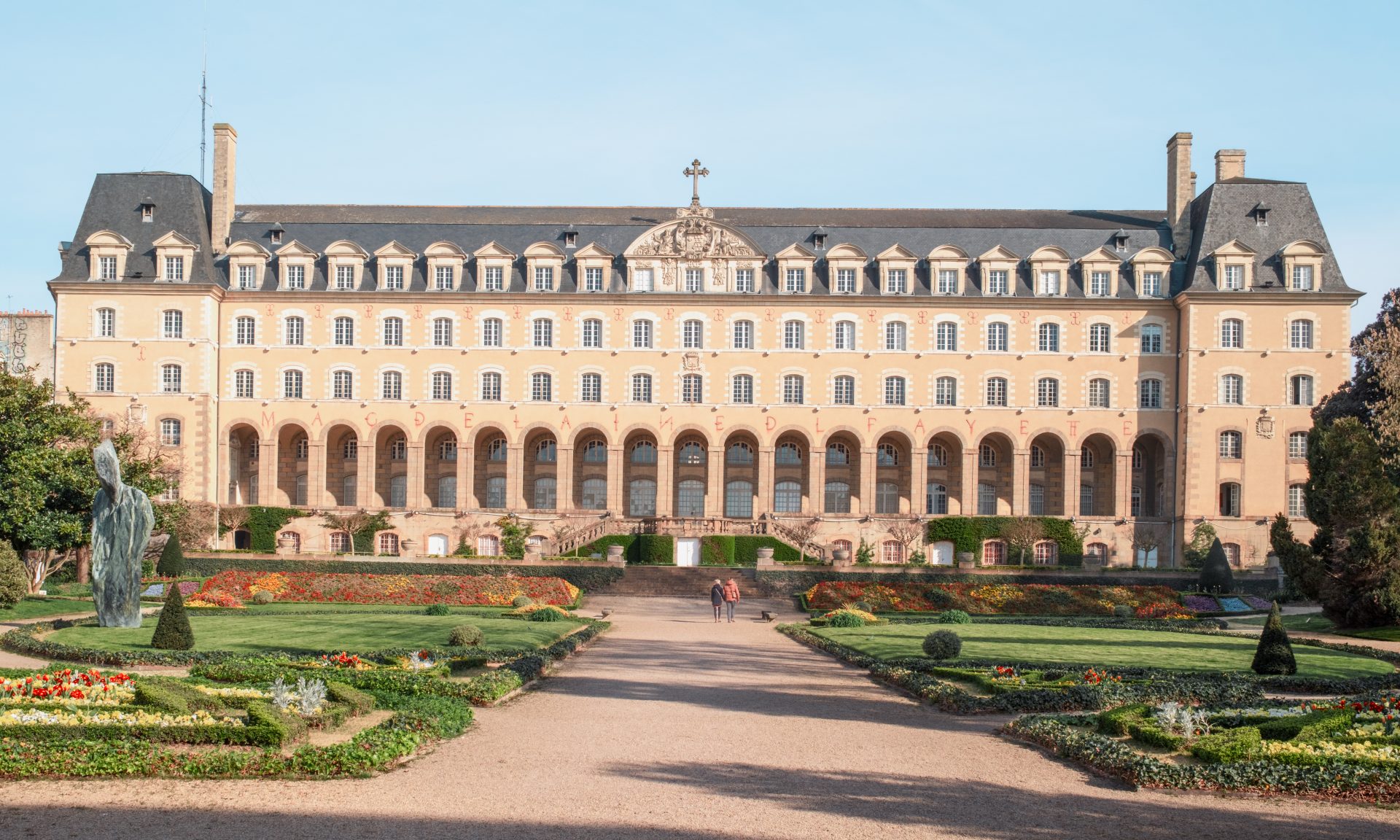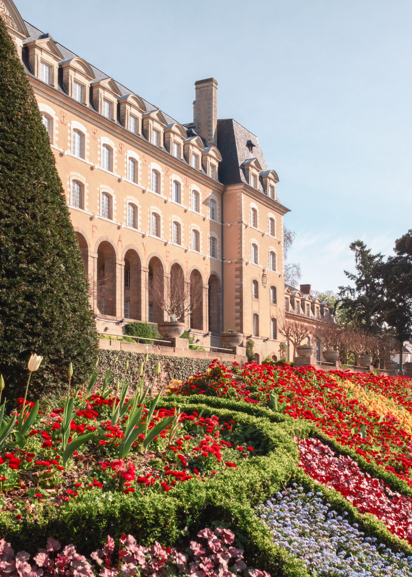 Moins vaste que le parc du Thabor, mais tout aussi agréable au printemps, le jardin du Palais Saint-Georges est une petite pépite en plein cœur de Rennes. Niché face à l’élégante façade classique de l’ancien abbaye bénédictine, il offre un cadre à la fois structuré et apaisant. Au printemps, les massifs sont particulièrement soignés. Les fleurs dessinent des compositions colorées qui contrastent avec la pierre claire du bâtiment. Les arches végétales et les alignements impeccables donnent au lieu une atmosphère presque graphique, idéale pour une pause en fin de matinée ou après un déjeuner en centre-ville. On aime s’y arrêter quelques minutes, observer les détails, profiter du calme tout en restant au cœur de la ville. Le jardin est également agréable avec des enfants : un bac à sable et quelques jeux permettent aux plus petits de s’amuser pendant que les parents savourent un moment au soleil. Le Palais Saint-Georges lui-même, avec sa longue façade symétrique, apporte une dimension patrimoniale forte à la balade. On passe facilement de l’animation du centre-ville à cette parenthèse verdoyante en quelques pas seulement.