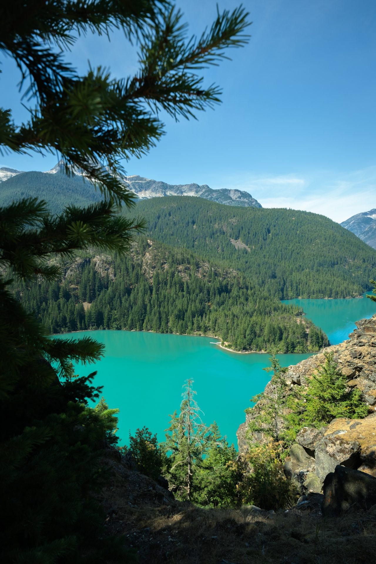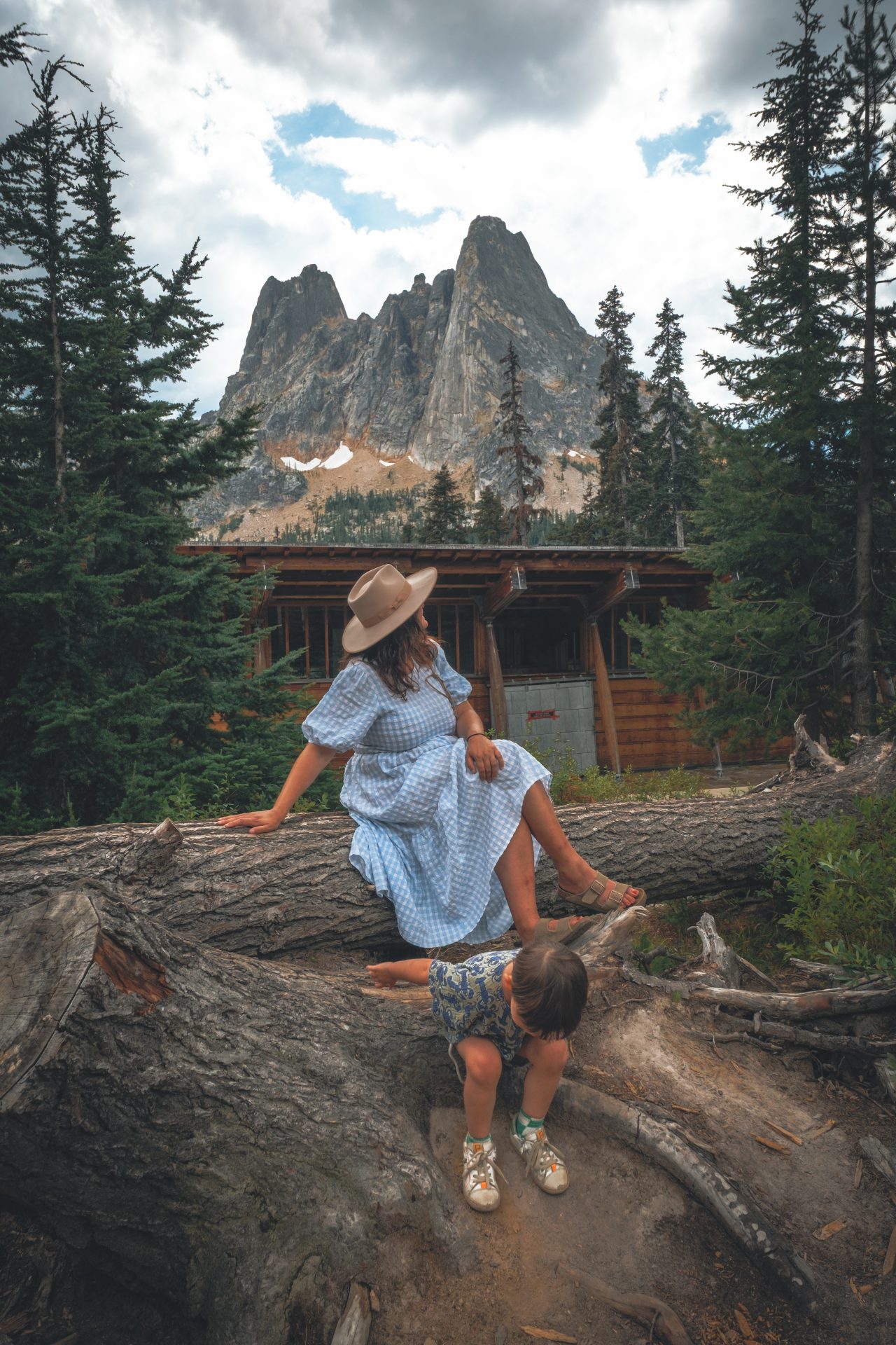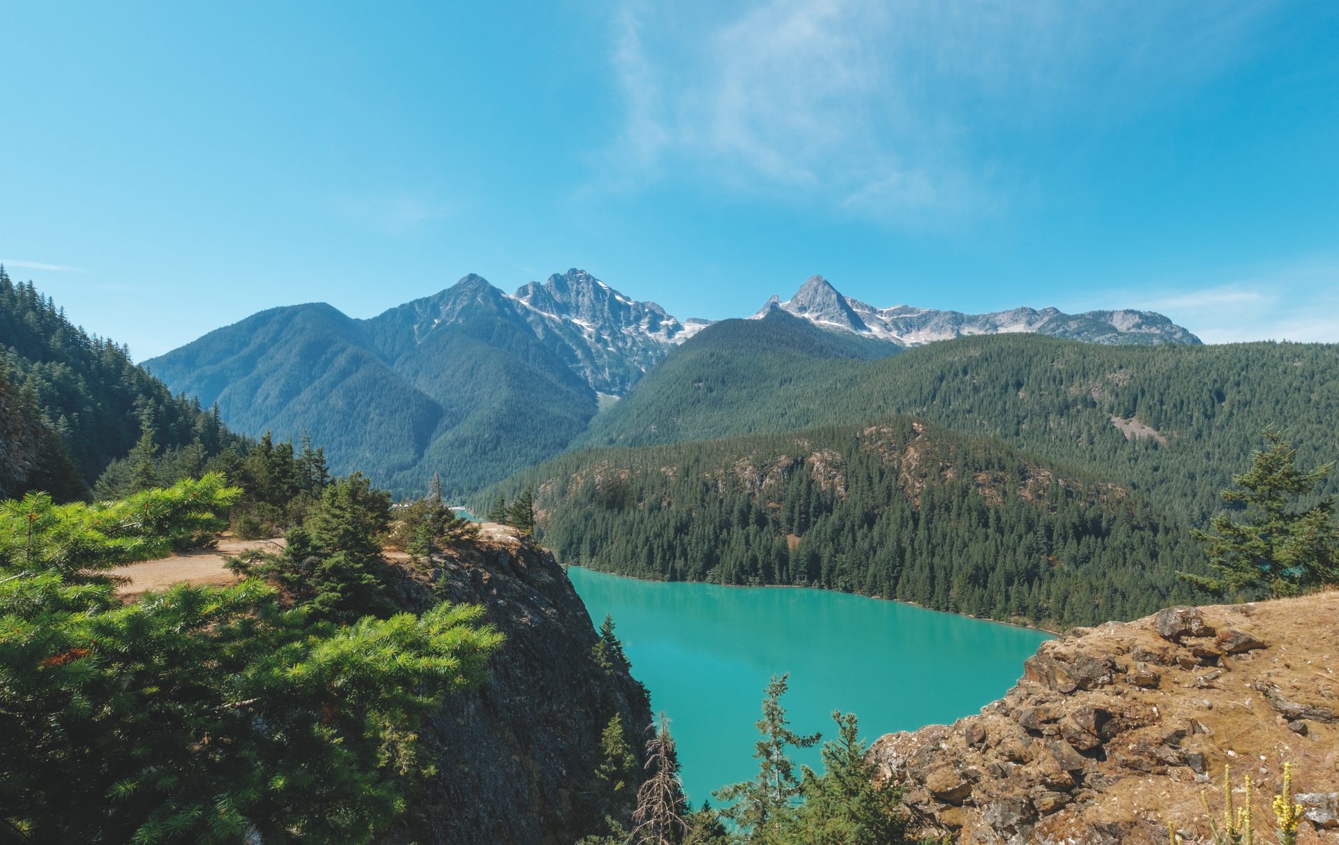 les plus sauvages et les moins fréquentés des États-Unis. Ici, pas de foule ni de villages touristiques : seulement des forêts à perte de vue, des montagnes déchiquetées et des lacs aux eaux incroyablement turquoise. Le simple fait de rouler sur la route scénique qui traverse le parc est déjà une expérience en soi. Notre première halte a été Rainy Lake Trail, une balade idéale avec un enfant. Le sentier, parfaitement plat et accessible en poussette, traverse une belle forêt avant de déboucher sur un lac d’un bleu profond, entouré de montagnes. James a adoré courir sur le chemin, et nous, on a savouré ce décor paisible, presque irréel par sa tranquillité. Nous avons ensuite pris la route jusqu’au Washington Pass Overlook. Ici, le panorama est spectaculaire : des sommets acérés se dressent devant nous, avec la route qui serpente dans la vallée en contrebas. C’est l’un de ces points de vue où l’on reste silencieux quelques instants, simplement pour admirer la beauté brute de la nature. Impossible de passer par North Cascades sans s’arrêter à Diablo Lake Overlook. Le lac, d’une couleur bleu émeraude presque irréelle, est sans doute l’image la plus emblématique du parc. Nous avons eu la chance de le voir par temps clair, et les contrastes entre l’eau turquoise et les montagnes sombres qui l’entourent étaient à couper le souffle.