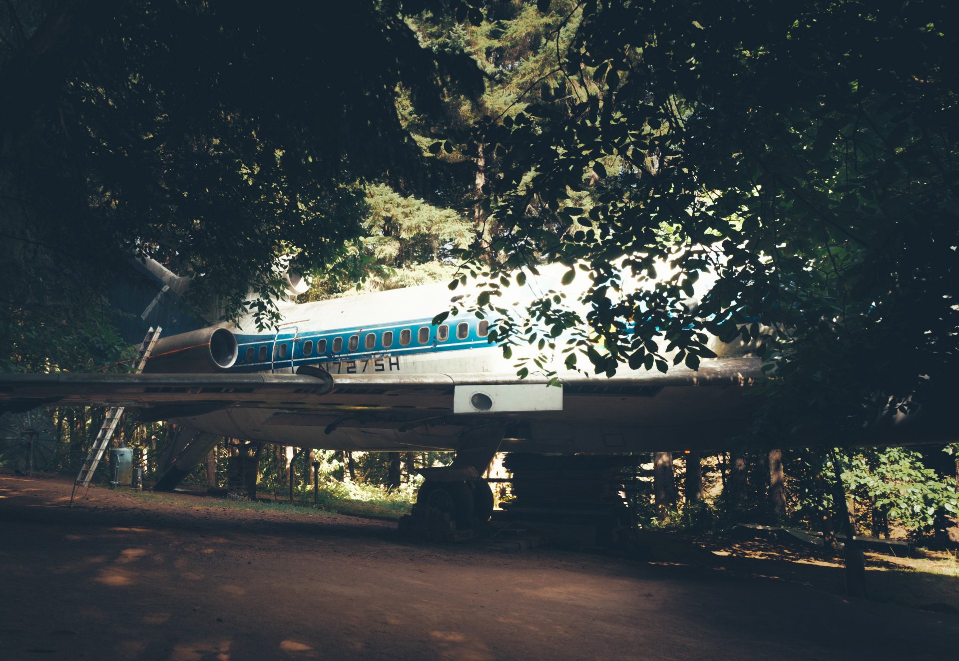 Après les paysages côtiers spectaculaires de Cannon Beach, nous avons pris la route vers une étape pour le moins insolite : Airplane Home. Caché dans une forêt de l’Oregon, ce lieu abrite un véritable avion transformé en maison par son propriétaire, Bruce. En avançant sur le petit chemin, on distingue peu à peu la silhouette de l’appareil, posé là comme s’il avait atterri en urgence au milieu des arbres. L’avion, un Boeing 727, conserve encore sa structure d’origine, et l’on imagine facilement comment il a été adapté en habitation atypique. Ce qui rend la visite encore plus particulière, c’est que Bruce, le propriétaire, autorise les voyageurs curieux à venir découvrir son avion. L’accès est possible librement entre 8h et 19h, à condition de rester respectueux et silencieux. Si vous avez la chance de croiser Bruce, qui vit selon l’heure japonaise, vous pourrez même visiter l’intérieur de l’avion. Pour cela, mieux vaut venir dans l’après-midi, quand il est éveillé. Nous avons adoré découvrir ce projet fou, parfaitement intégré dans la végétation environnante. Pour James, c’était fascinant de voir un avion “atterri” en pleine forêt, et pour nous, un arrêt original qui sort complètement des sentiers battus. Nous avons même sorti le drone pour capturer la scène, et la vue aérienne révèle à quel point l’avion semble à sa place dans ce décor forestier.