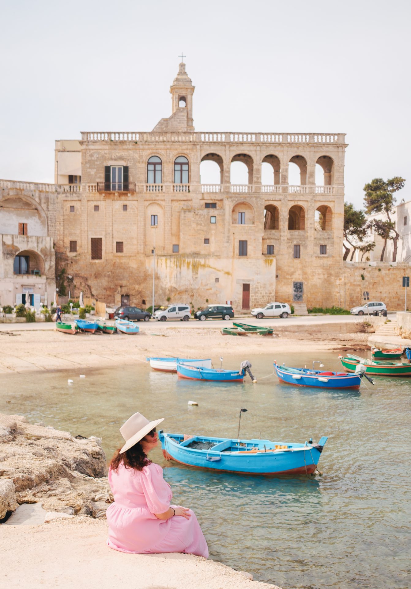 Abbazia di San Vito a été l’une de nos premières belles surprises dans les Pouilles. Ce petit port de pêche situé à quelques minutes de Polignano a Mare est encore relativement discret et mérite pourtant vraiment le détour. Le décor est absolument magnifique : une petite abbaye posée au bord de la mer, quelques barques colorées amarrées dans le port et une eau aux reflets turquoise. L’ensemble dégage une atmosphère paisible et presque hors du temps. Lorsque nous y sommes passées, il n’y avait quasiment personne. Nous avons pris le temps de nous promener le long du petit port et d’admirer la vue sur la mer Adriatique. C’est le genre d’endroit simple, mais incroyablement photogénique, qui donne immédiatement le ton du voyage dans les Pouilles.