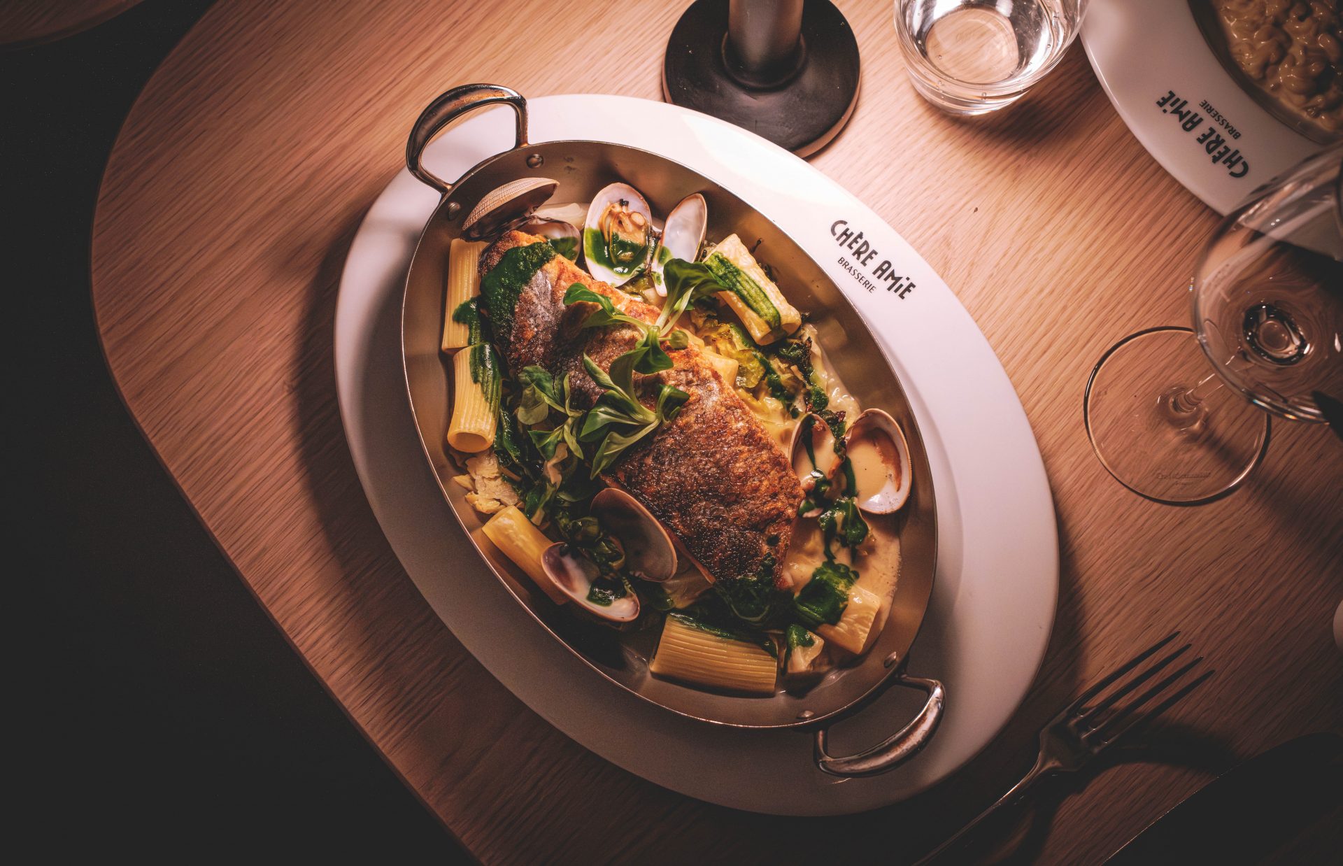Dernière adresse de notre séjour : Chère Amie, une brasserie chic et moderne située à l’entrée de la Neustadt, elle aussi classée à l’UNESCO. Nous avons adoré l’expérience. Le lieu est impressionnant, avec une décoration qui mêle élégamment codes contemporains et classiques, en clin d’œil à l’histoire postale du bâtiment. On peut s’installer sur de grandes banquettes face à la cuisine ouverte ou autour de l’imposant bar central. Côté assiette, chacun y trouve son bonheur. Le buffet de la mer est particulièrement apprécié. De mon côté, j’ai opté pour un risotto de coquillettes au comté, absolument délicieux. Maxime a choisi un filet de bar grillé aux palourdes, accompagné d’un fricassé de chou vert, de rigatoni, d’un beurre blanc et d’un coulis de persil. Une cuisine gourmande, maîtrisée, et très agréable.