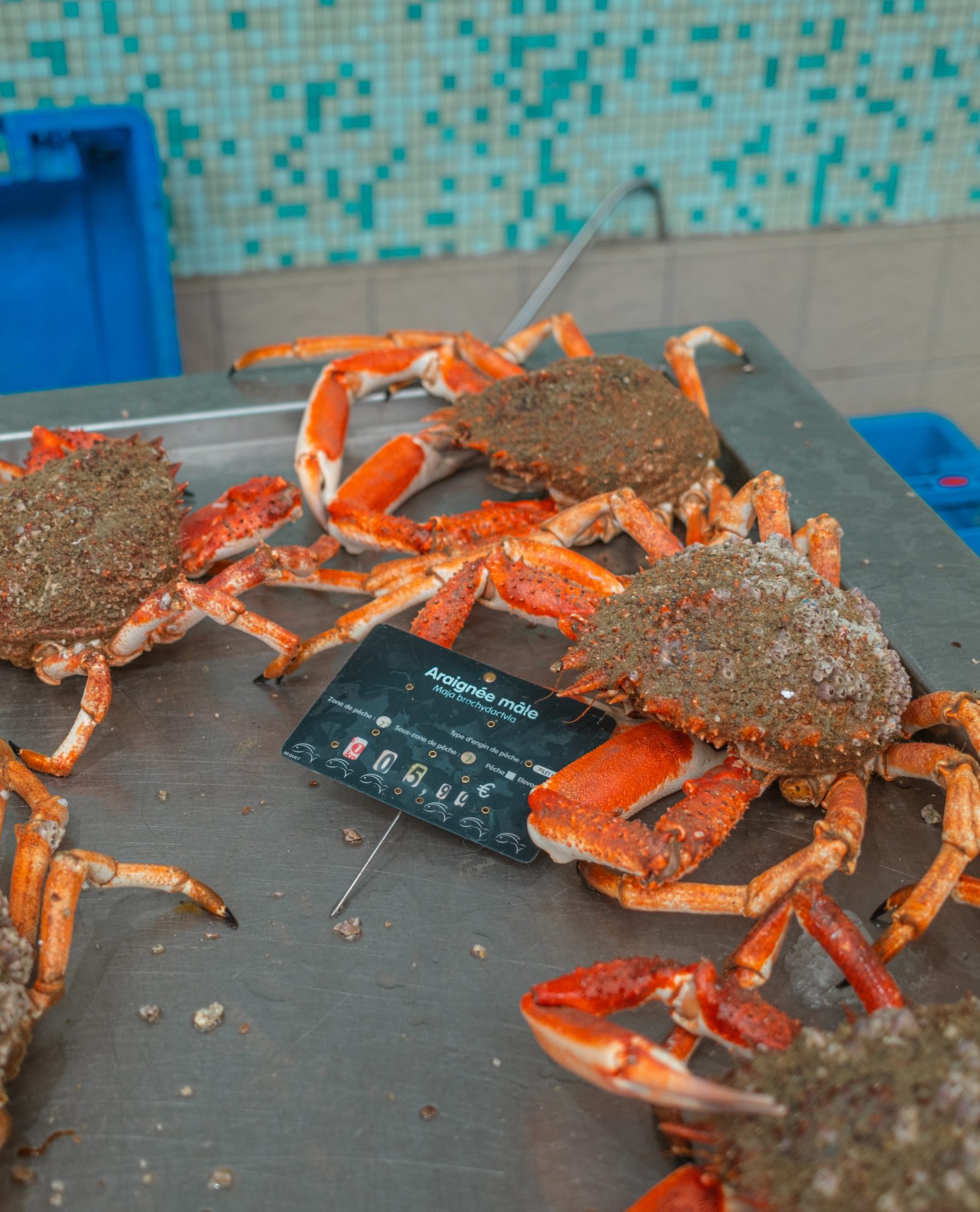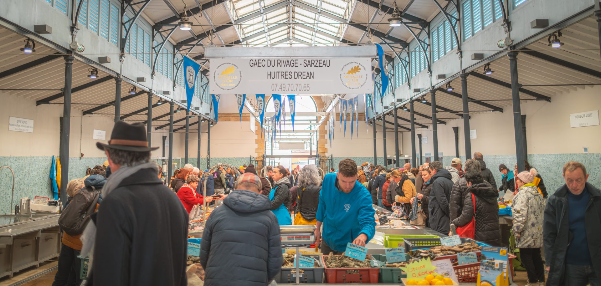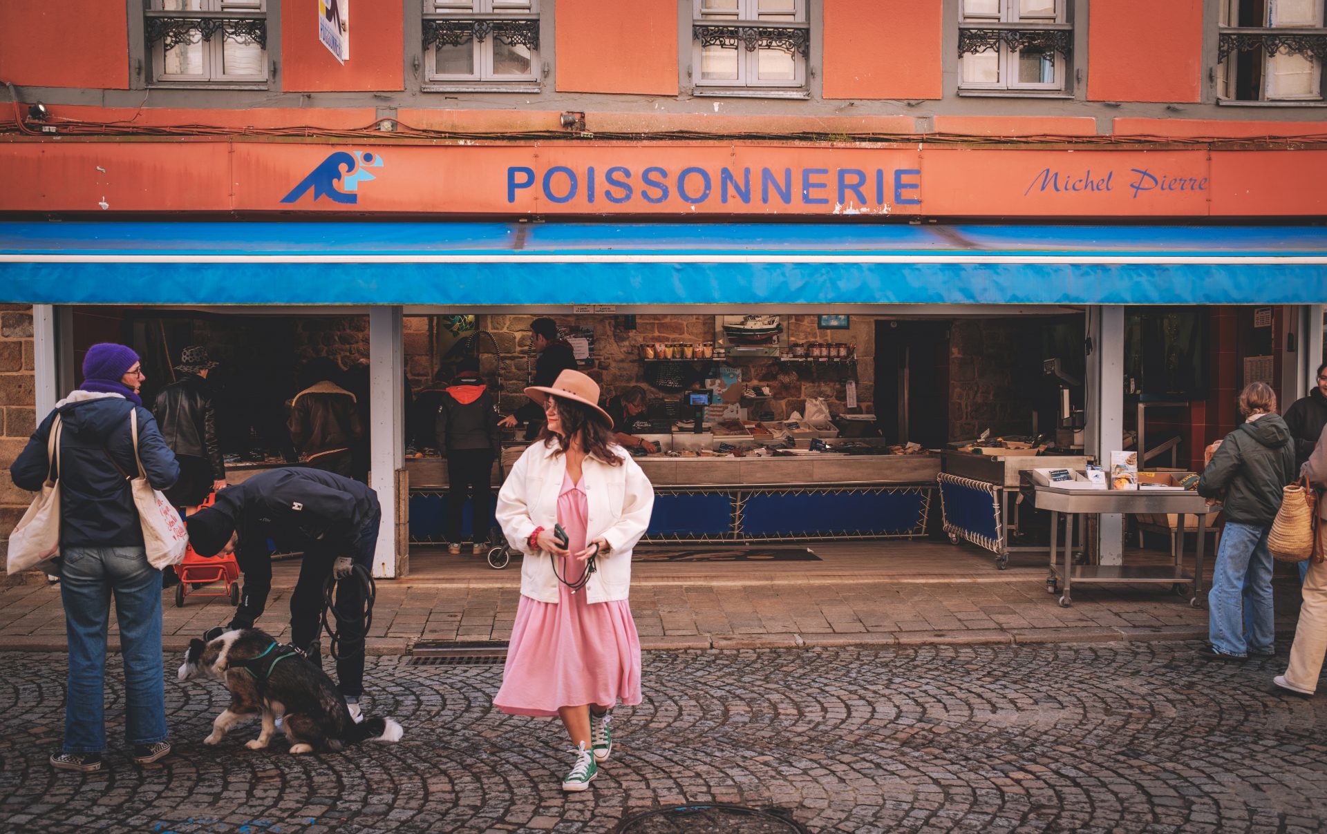 Mais le marché de Vannes, c’est aussi les Halles des Lices et les Halles aux poissons, deux espaces couverts incontournables. Les Halles des Lices regroupent des commerçants aux produits irréprochables — charcuteries fines, fromages de caractère, volailles du terroir. Les Halles aux poissons, elles, célèbrent la mer dans toute sa splendeur : huîtres du Golfe, coquilles Saint-Jacques, langoustines, crevettes fraîches. Le tout dans une atmosphère vivante, colorée, parfumée. Nous avons d’ailleurs déjeuné tous les trois aux halles ce samedi-là, et ce fut l’un des meilleurs repas du séjour. Simple, frais, délicieux — et les yeux de James devant les poissons n’avaient pas de prix.