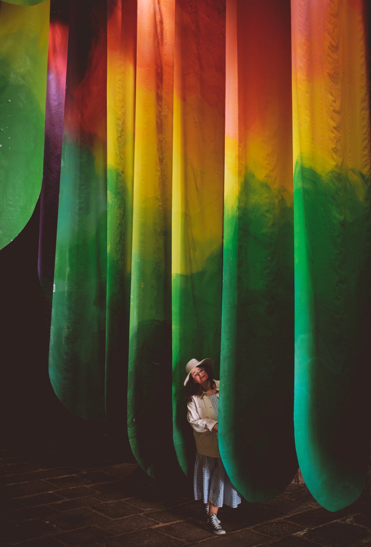 Au cœur de Vannes, une exposition haute en couleurs nous a arrêtés dans notre flânerie. Dans le passage central de La Cohue, une installation artistique saisissante a investi l’espace le temps de quelques semaines. L’œuvre est signée Elsa Tomkowiak, et elle s’appelle UNDA — Traversée spectrale. Dès l’entrée dans le passage, on comprend que quelque chose de particulier se passe : des lés de tissus colorés s’enchaînent sur toute la longueur du couloir, comme une houle suspendue qui décompose le spectre visible de la lumière. Les couleurs se succèdent avec une précision et une poésie étonnantes — du bleu profond au jaune solaire, en passant par des transitions de vert et d’orange.
